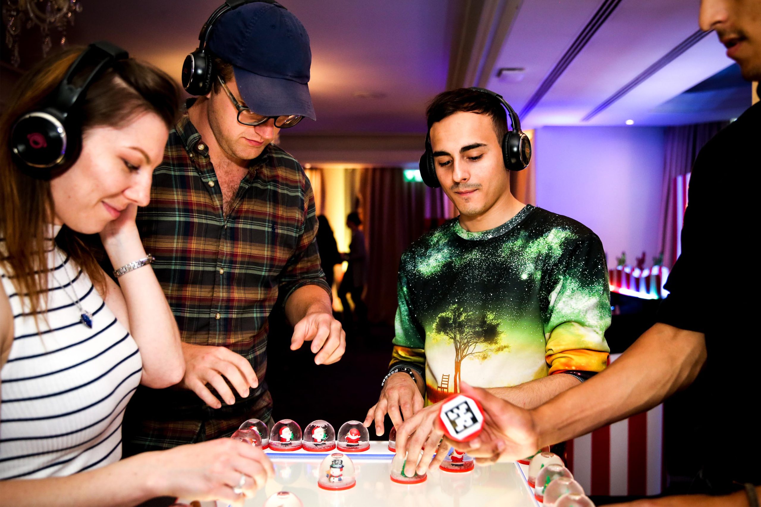 Each of up to four players controls a set of mini snow globes: Christmas trees for drums, stockings for basslines, snowmen for melodies and Santas for vocals. Each snow globe plays a different sample as you place it into the centre.