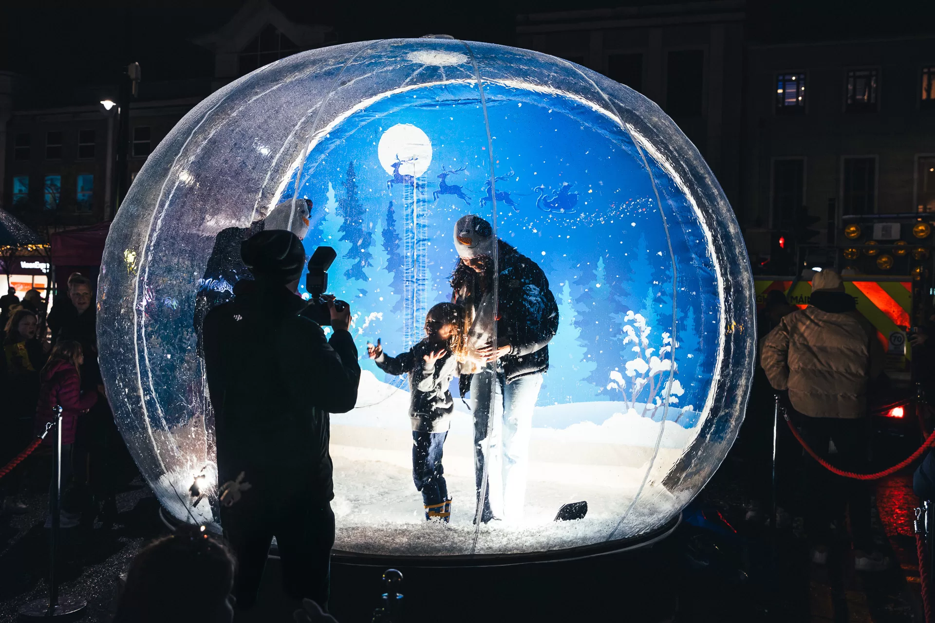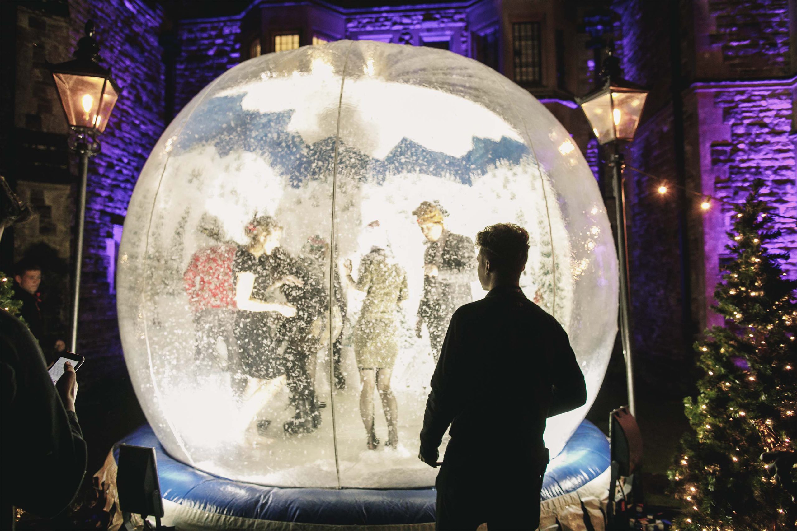 This experience includes a stunning, inflatable globe, tonnes of snow, lights and silver posts and red rope to decorate the surround.